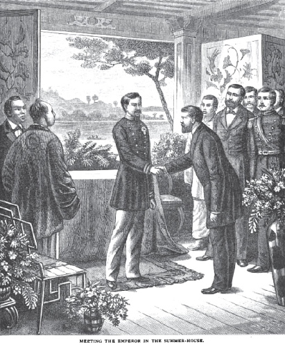 (日光から帰った後に)延遼館に滞在した後半の日々は、度重なる夕食会や園遊会、多くの落ち着いて楽しいパーティーがあった。イギリス公使のハリー・パークス卿から宴会への招待が来たが、我々は近日中に出発せねばならず、毎日、毎晩の予約があり、将軍はパークス卿の招待を断らざるを得なかった。アメリカ公使館脇にある、東京タイムズ主幹のハウス氏の、海を見下ろす小さな綺麗な家で昼食会があった。私はこのハウスを、記憶から消え去りそうな昔々、大層魅力的だがいつも実入りがあるわけでもないジャーナリズムの分野で、世界に雄飛しようと思っている注目度の高い若者グループの中でも、特別に聡明な一人として記憶していた。