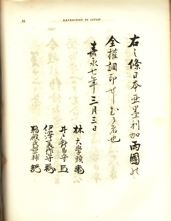 下のイメージはペリー提督「遠征報告」第2巻に載っている、調印時の神奈川條約最終部分、署名・花押のページ